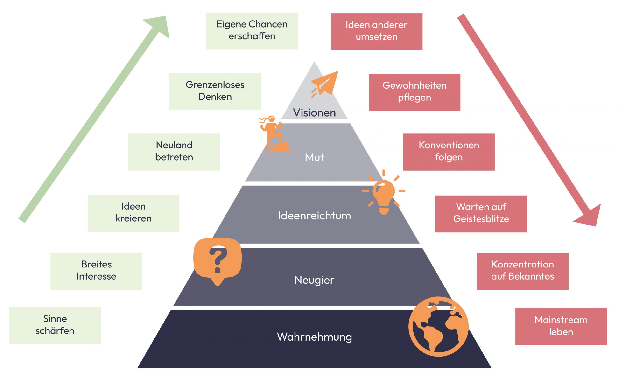 Aus gedanklicher Weite entsteht kreative Vielfalt: Du entwickelst in kurzer Zeit eine große Bandbreite relevanter Ideen. Deine Kreativität wird zu einer verlässlichen, jederzeit abrufbaren Ressource. - Mut entwickeln